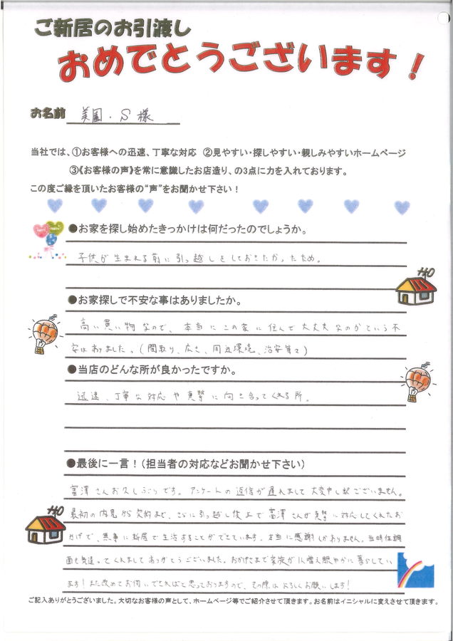 お子様のご誕生、本当におめでとうございます!これからのご成長が楽しみですね。ご希望の期限内にお引渡しまで完了出来て安堵しております。お近くに来られた際は是非お立ち寄りください。またお会いできるのを楽しみにしております。