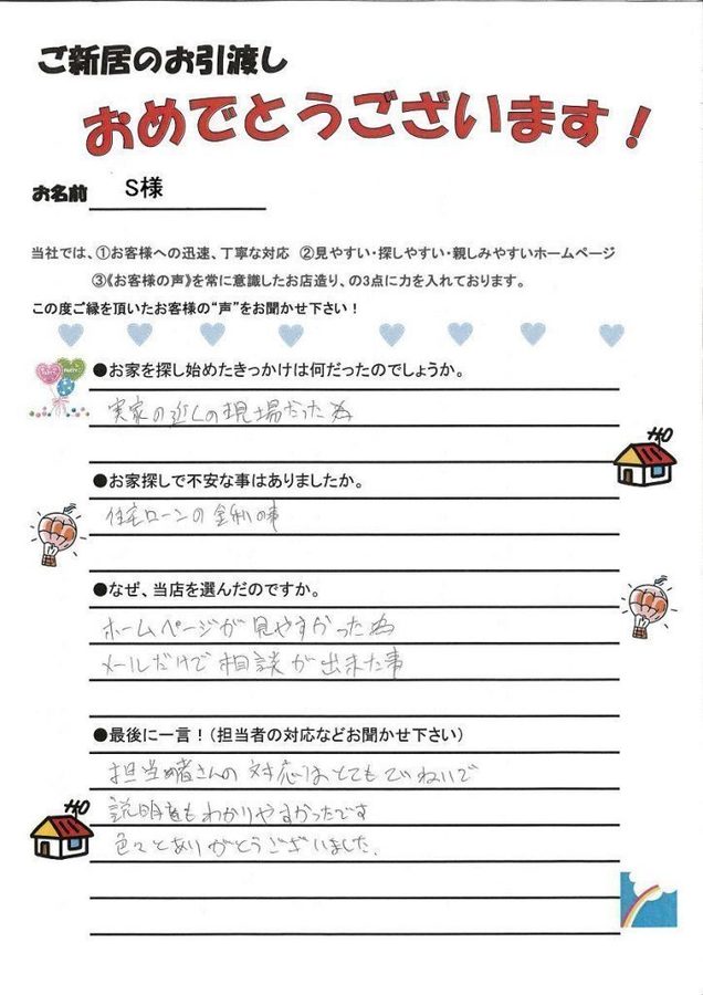 最初はしばらくメールでのやりとりだったS様。ローンのご相談がメインでした。 そして無事ローンも通り、しかも有利な条件で通す事が出来て、私も嬉しかったです。 ご希望だったご実家近くのご新居で、Sさんご家族の楽しそうな声が聞こえてきそうです。 おめでとうございました。